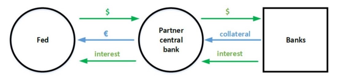 The FED describes the swaps as follows. In general, these swaps involve two transactions. When a foreign central bank draws on its swap line with the Federal Reserve, the foreign central bank sells a specified amount of its currency to the Federal Reserve in exchange for dollars at the prevailing market exchange rate. The Federal Reserve holds the foreign currency in an account at the foreign central bank. The dollars that the Federal Reserve provides are deposited in an account that the foreign central bank maintains at the Federal Reserve Bank of New York. At the same time, the Federal Reserve and the foreign central bank enter into a binding agreement for a second transaction that obligates the foreign central bank to buy back its currency on a specified future date at the same exchange rate. The second transaction unwinds the first. According to the FED, at the conclusion of the second transaction, the foreign central bank pays interest, at a “market-based rate”.